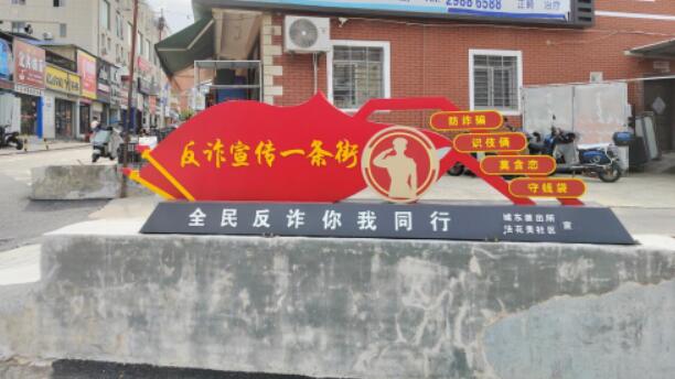 城东派出所和华大派出所联合华大街道、法花美社区,结合华大学生街美食文化的特色,在空间布局上自上而下、由内到外进行融入式宣传:8条空中条幅展示的反诈“灵魂八问”、街入口处的“警言警语”、反诈宣传警示墙、餐饮店门口的立式宣传“案例小黑板”、街中心的LED大屏播放反诈宣传片……处处都巧妙融入了反诈元素,帮助大家在潜移默化中接收反诈知识。