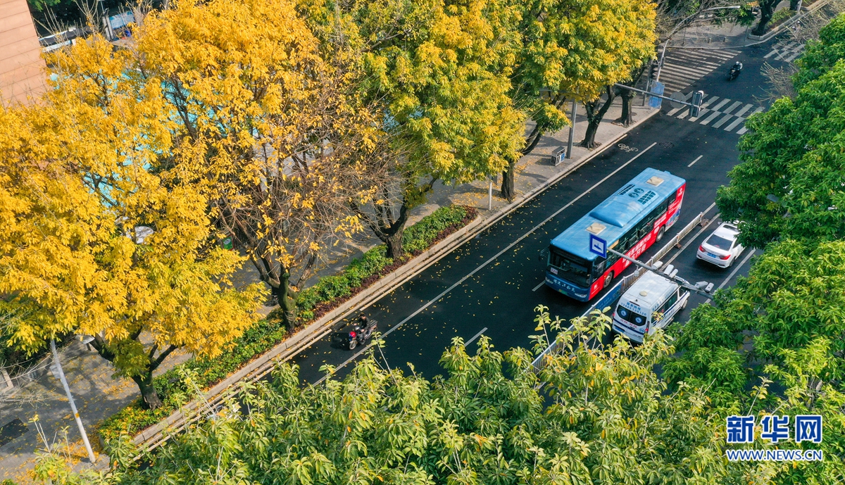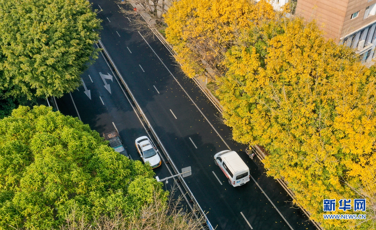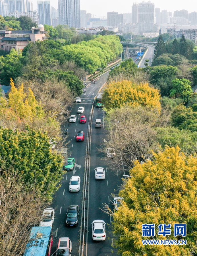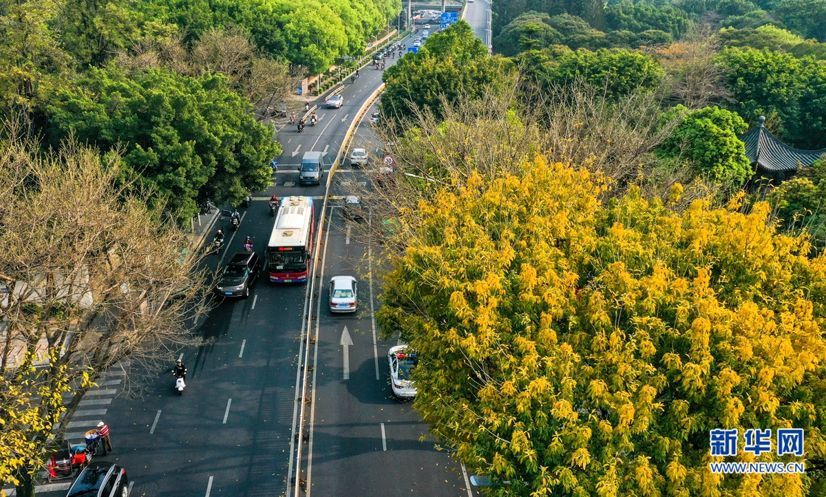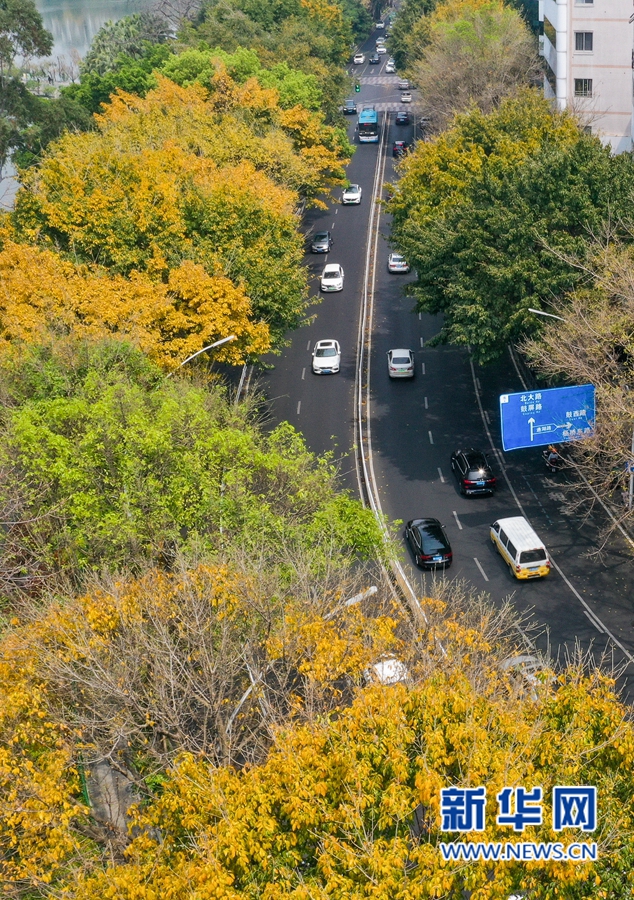 福州市鼓楼区湖滨路上,一些行道树叶子金黄,簇拥着往来车辆,构成一幅浪漫图景(3月21日摄,无人机照片)。新华网 肖和勇 摄