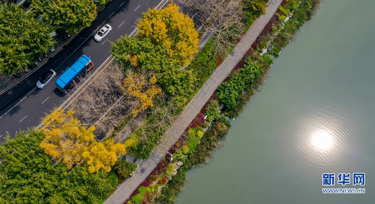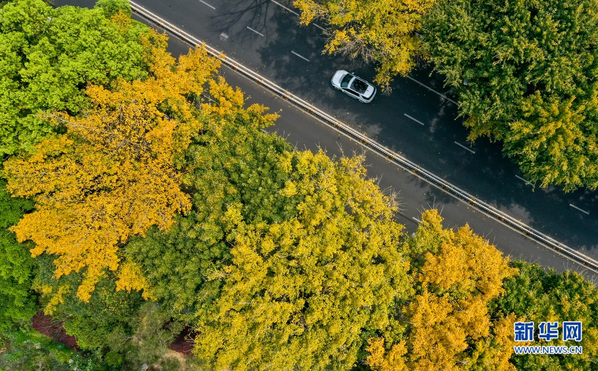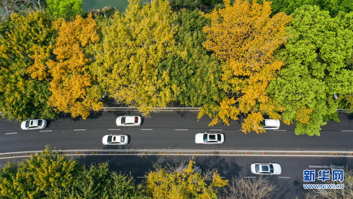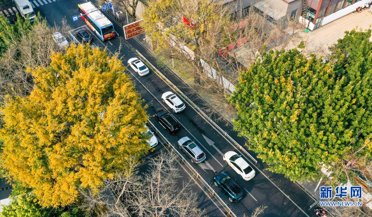 福州市鼓楼区湖滨路上,一些行道树叶子金黄,簇拥着往来车辆,构成一幅浪漫图景(3月21日摄,无人机照片)。新华网 肖和勇 摄