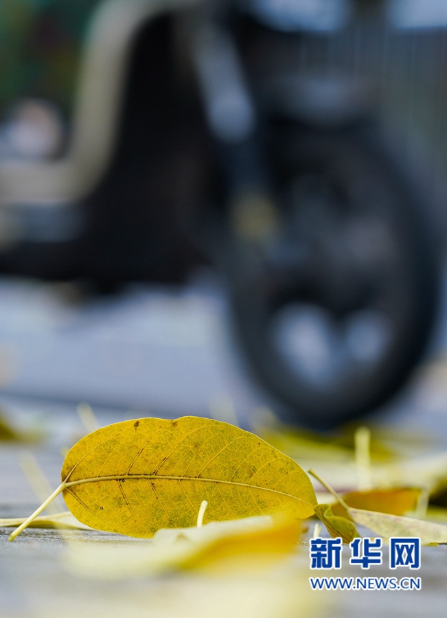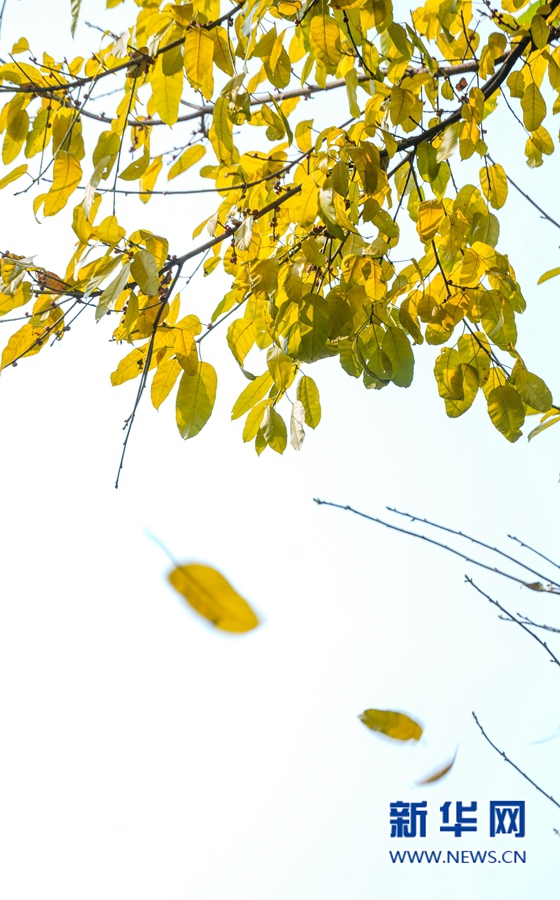 3月21日,福州市区白马路上,黄叶在风中飘落。新华网 肖和勇 摄