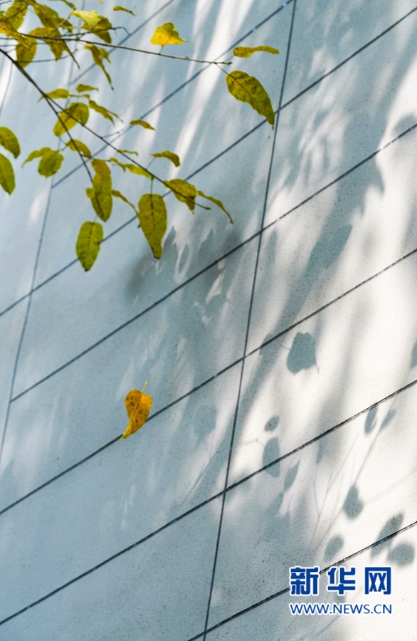 这是在福州市白马路上拍摄到的行道树。枝叶映照在墙上,黄叶缓缓飘落(3月21日摄)。新华网 肖和勇 摄