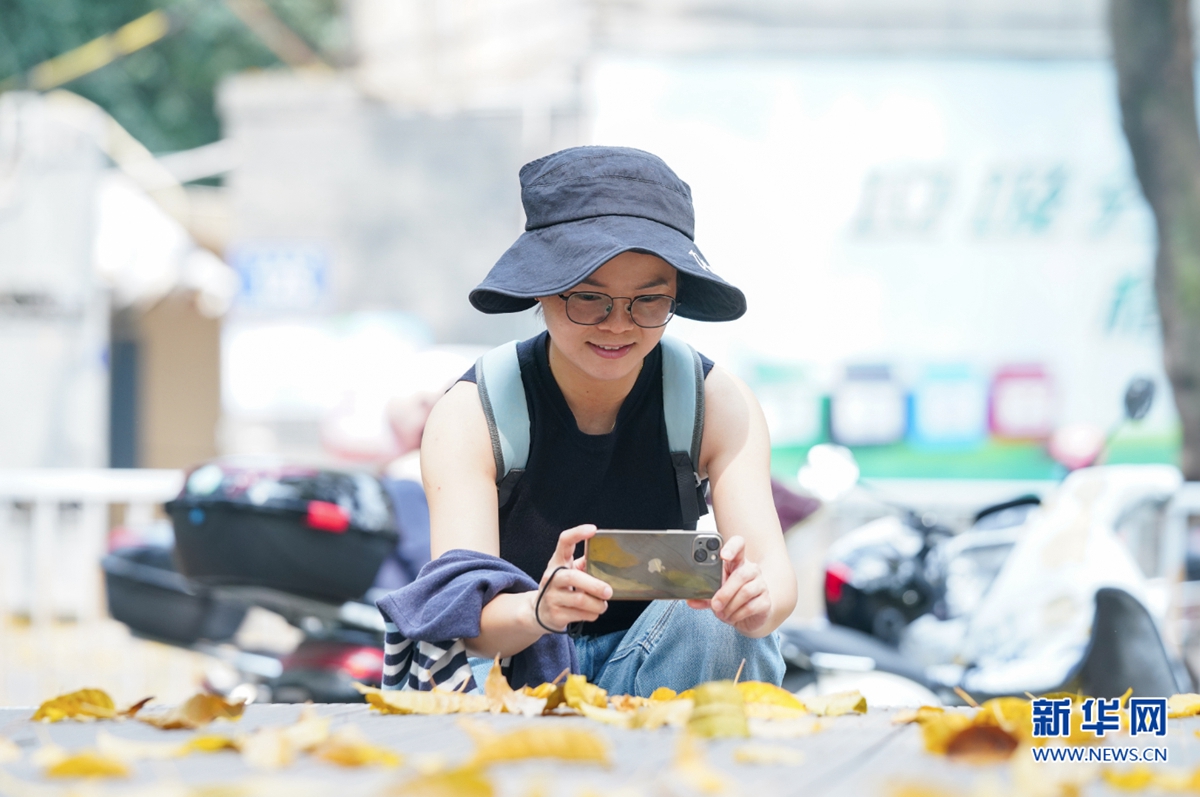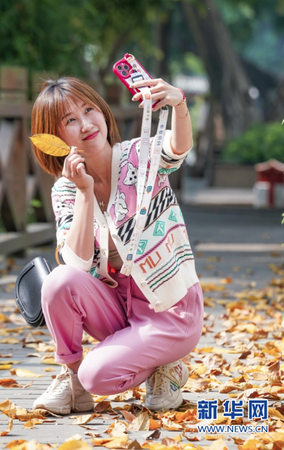 3月21日,福州市区白马路人行道上,市民在落叶间自拍留影。新华网 肖和勇 摄