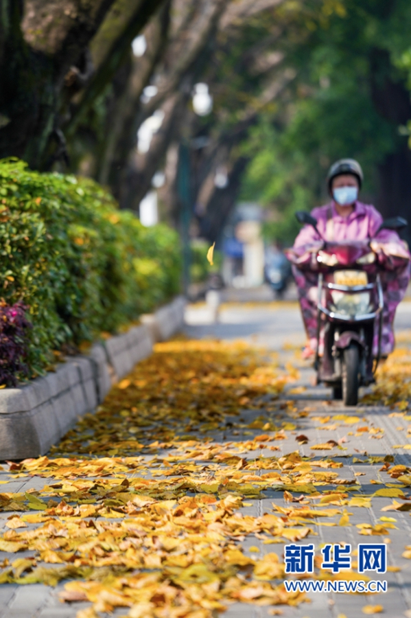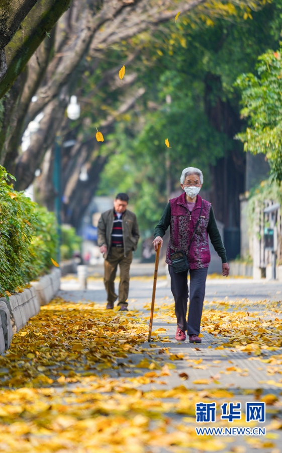 3月21日下午,福州市区白马路人行道上,市民在落叶间漫步。新华网 肖和勇 摄