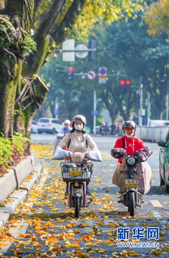 3月21日下午,福州市区白马路上,非机动车道上洒满落叶,市民骑车从落叶间经过。新华网 肖和勇 摄