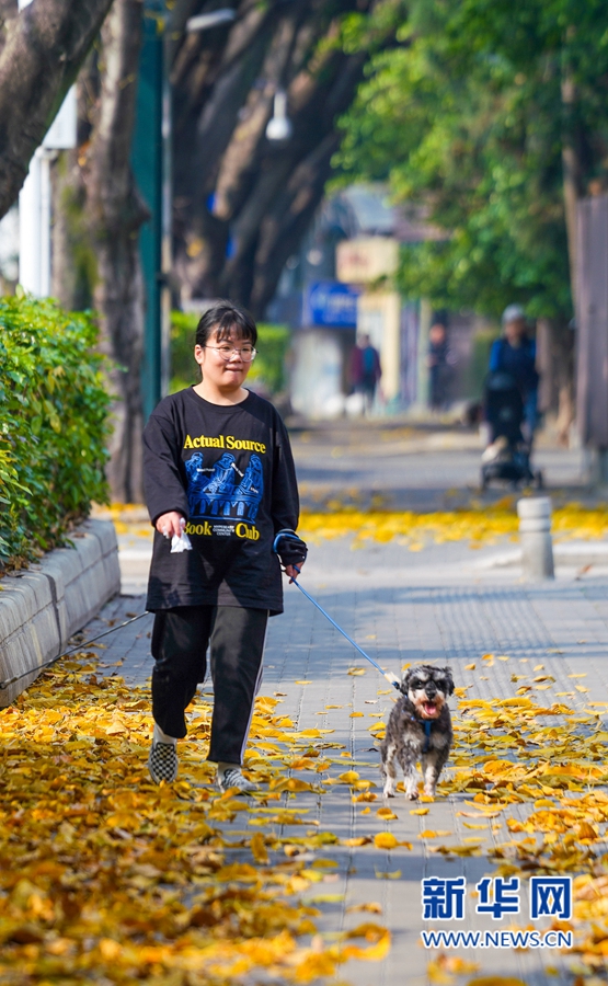 3月21日午后,福州市区白马路人行道上,市民带着宠物狗在落叶上散步。新华网 肖和勇 摄