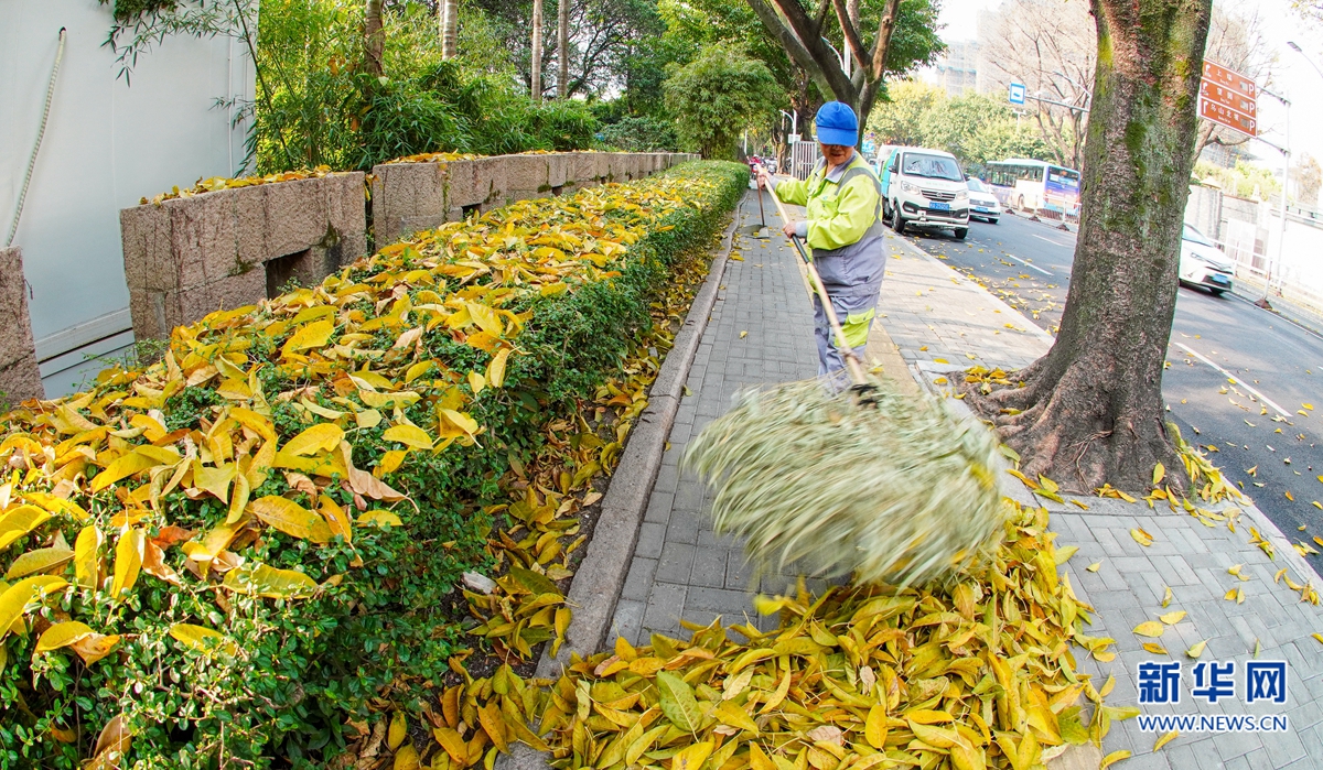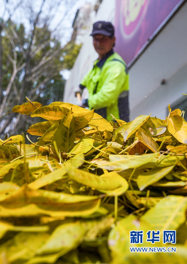 3月21日下午,福州市区白马路上,环卫工人正在清扫落叶。新华网 肖和勇 摄