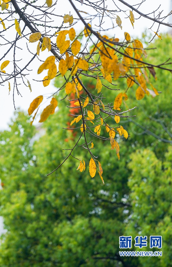 福州市仓山区建新中路,黄叶与绿树形成鲜明对比,秋景与春色同框(3月21日摄)。新华网 肖和勇 摄