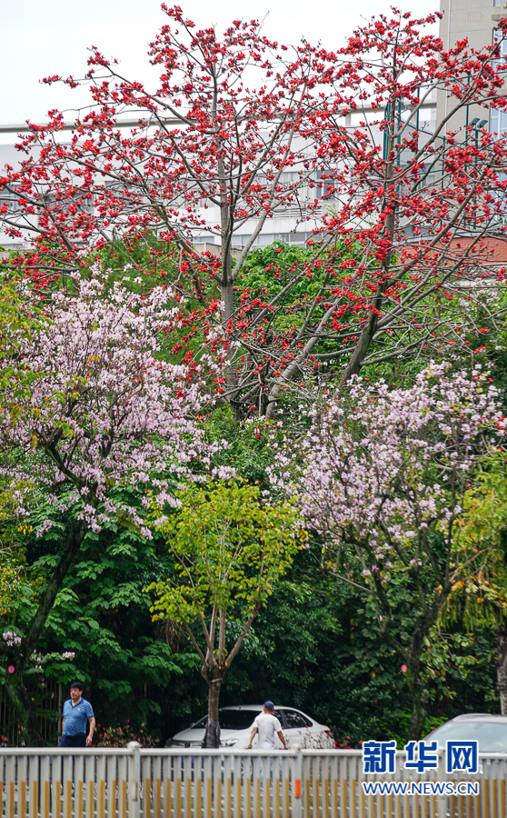 4月19日,福州市工业路,木棉花和羊蹄甲同框盛放。新华网 肖和勇 摄