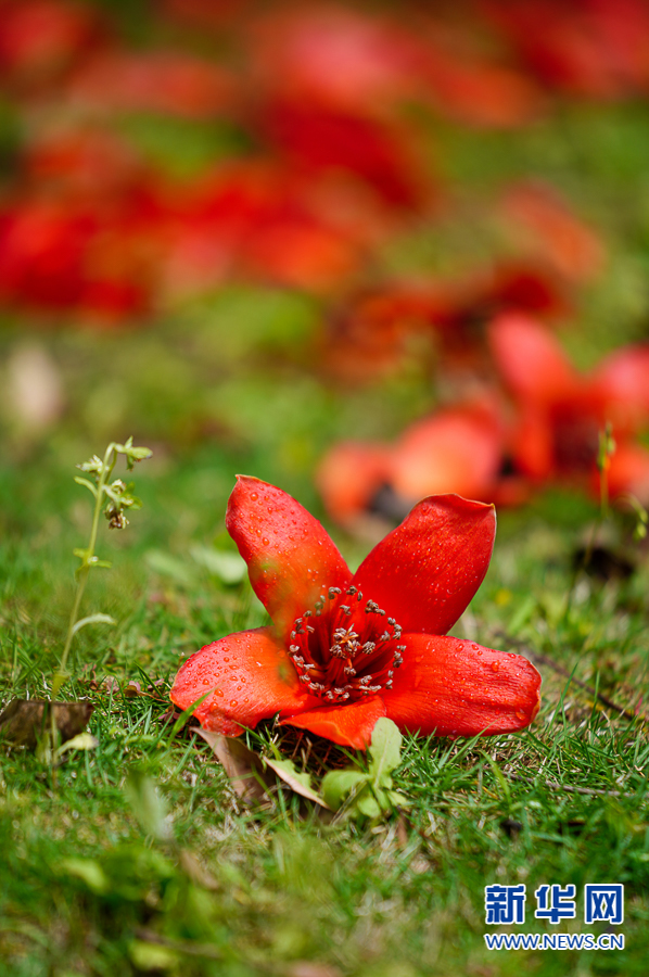 4月19日,一阵春雨过后,木棉花落满地。新华网 肖和勇 摄
