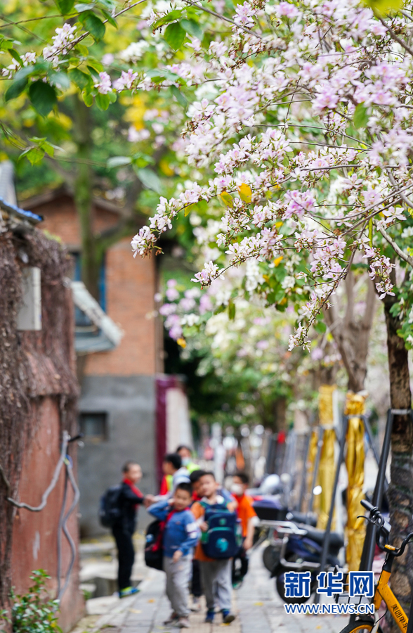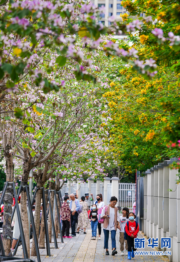 4月19日下午,福州市岳峰中心小学门口,羊蹄甲盛放。学生放学后结伴从花下回家。新华网 肖和勇 摄