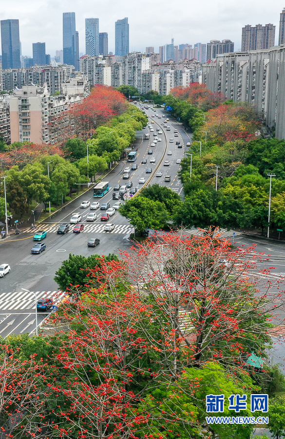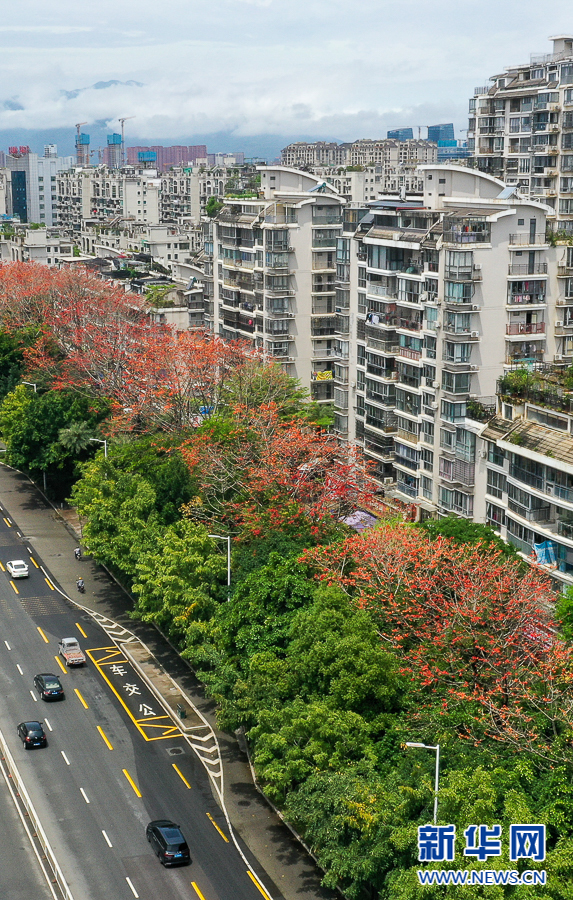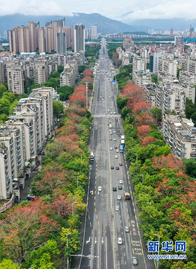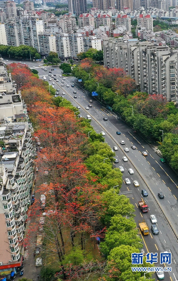 这是金山大道上盛开的木棉花(4月19日摄,无人机照片)。新华网 肖和勇 摄