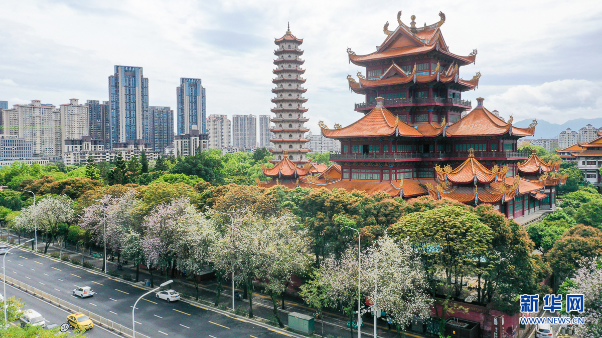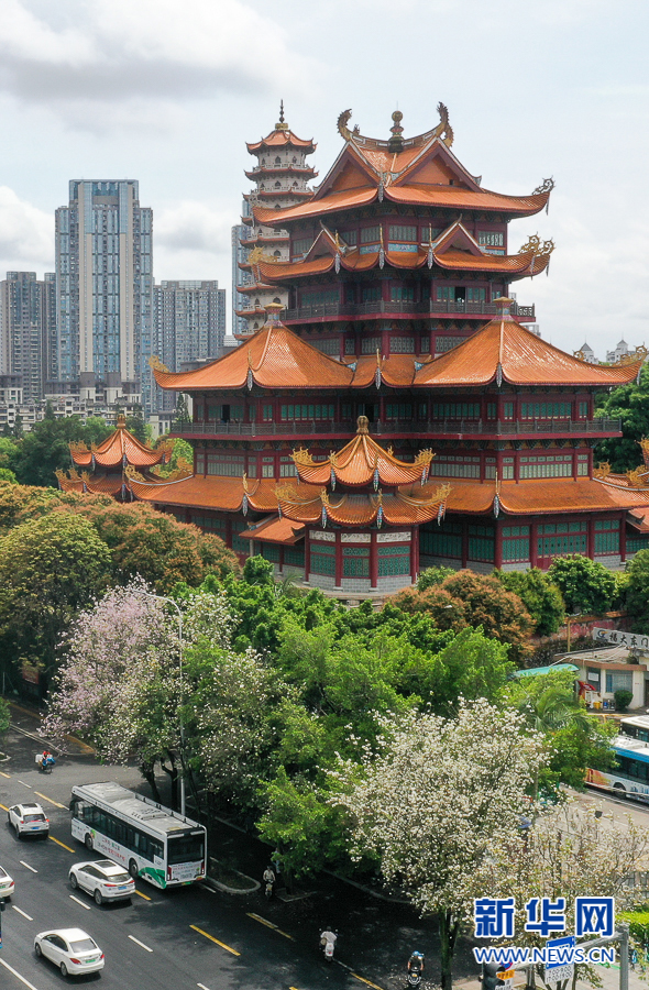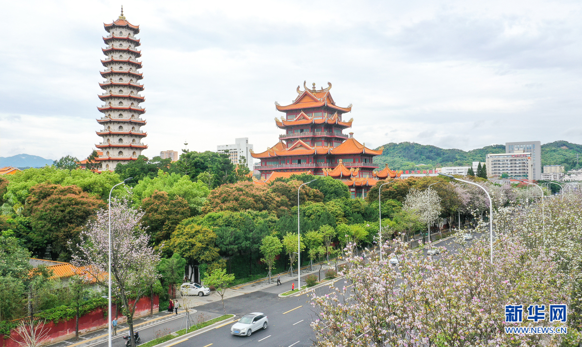 福州工业路西禅寺路段,盛开的羊蹄甲簇拥着古寺古塔(4月19日摄,无人机照片)。新华网 肖和勇 摄