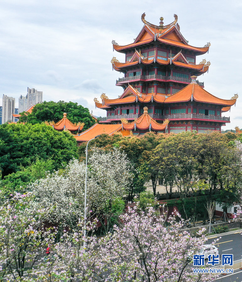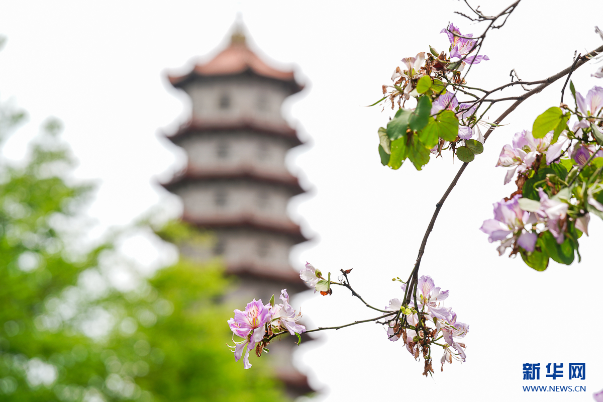 盛开的羊蹄甲与西禅寺古塔。新华网 肖和勇 摄
