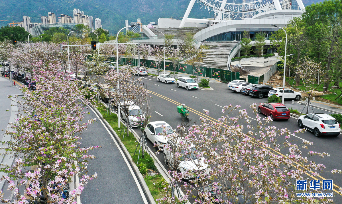 金山大道上,木棉花开(4月19日摄,无人机照片)。新华网 肖和勇 摄