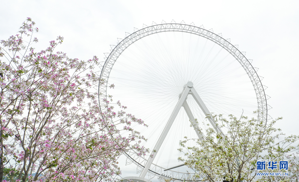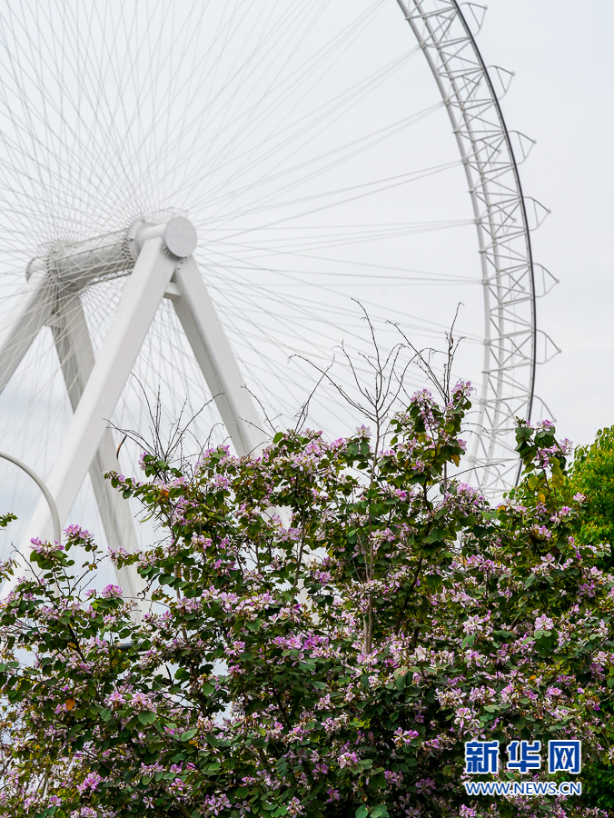 这是在晋安湖公园附近拍摄到的摩天轮与羊蹄甲(4月19日摄)。新华网 肖和勇 摄