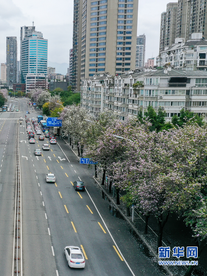 福州市工业路上,羊蹄甲开满枝头,车从花树下开过,烂漫唯美(4月19日摄,无人机照片)。新华网 肖和勇 摄