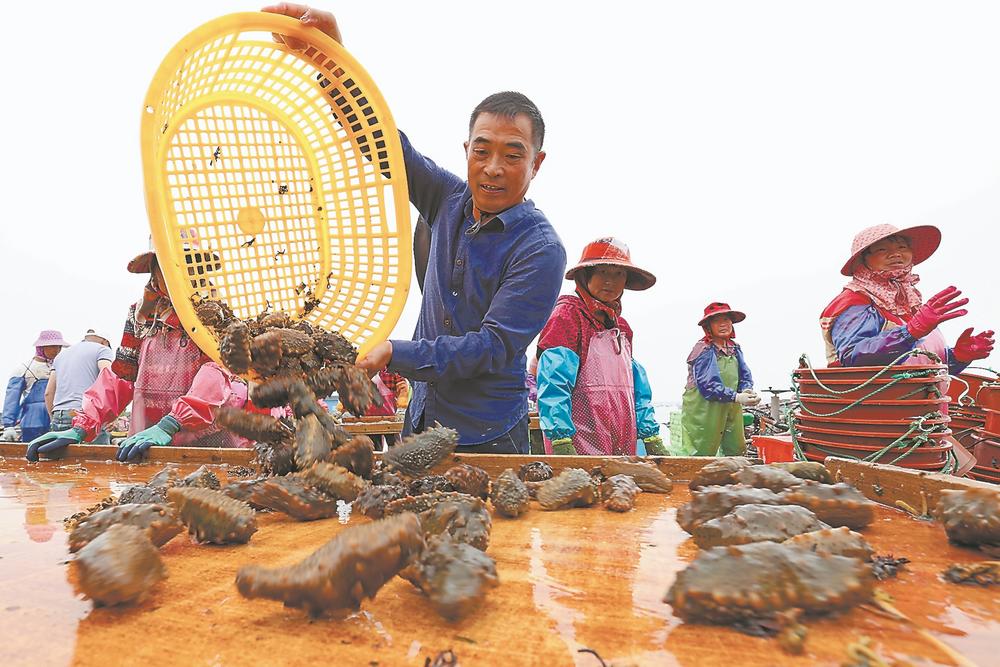 连江县“北参南养”模式持续增量发展,今年海参养殖总量达5000多万只,预计总产量可达6500多吨。图为27日,在连江县筱埕镇的海参养殖区,养殖户在清洗、分拣刚捕捞的海参。(王旺旺 摄影报道)