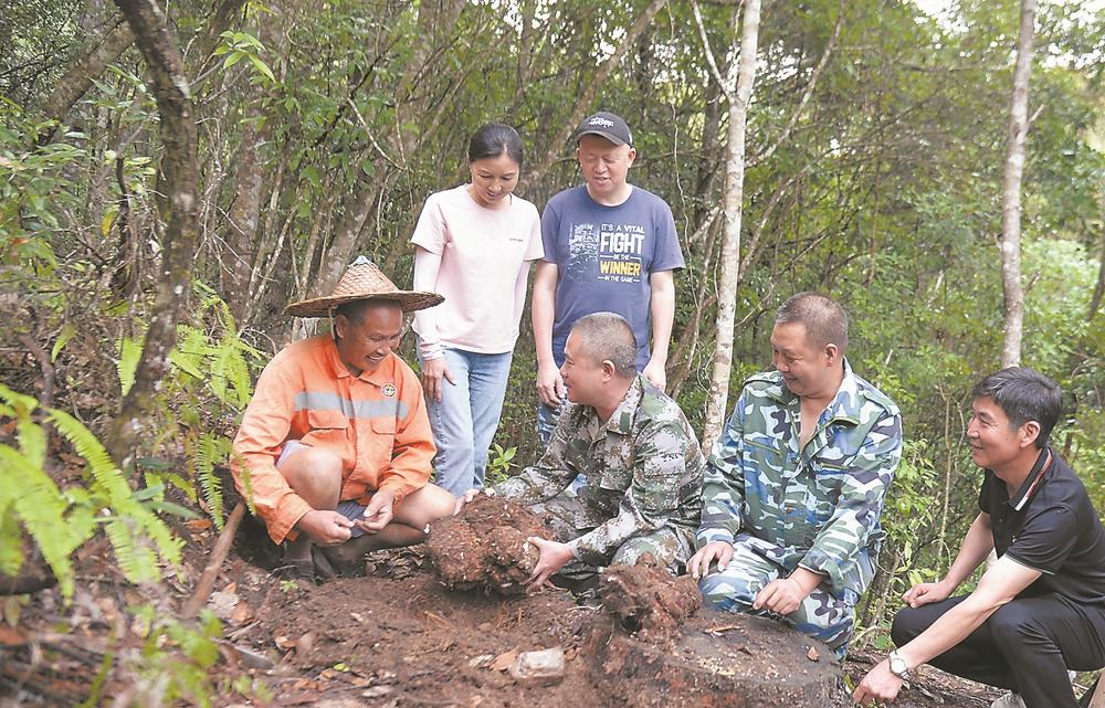 眼下,建瓯市部分乡镇种植的茯苓正在陆续采挖(如图)。6月10日,在建瓯市东峰镇长溪村丁明忠林业农场的段木茯苓种植基地里,村民们手拿锄头小心翼翼地采挖茯苓,一个个黑乎乎的“大疙瘩”被完整地挖了出来。虽然是第一年种植,但挖出来的“大疙瘩”一个比一个大,现场甚至挖掘到一个重达33公斤的茯苓,着实少见。
