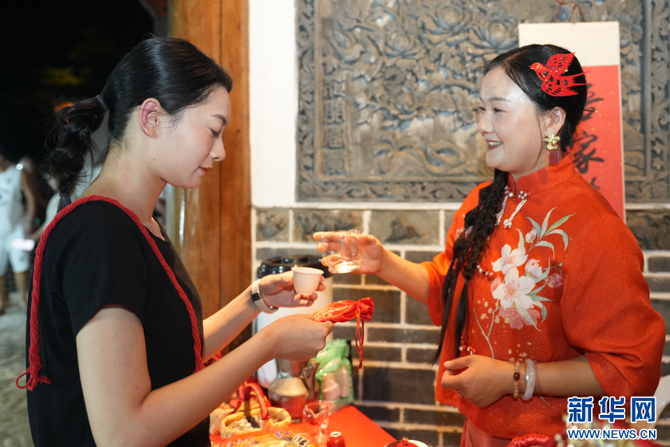 9月25日晚,“好物市集”上,游客在观赏非遗文创产品,了解南平政和县传统习俗“新娘茶”。新华网 肖和勇 摄