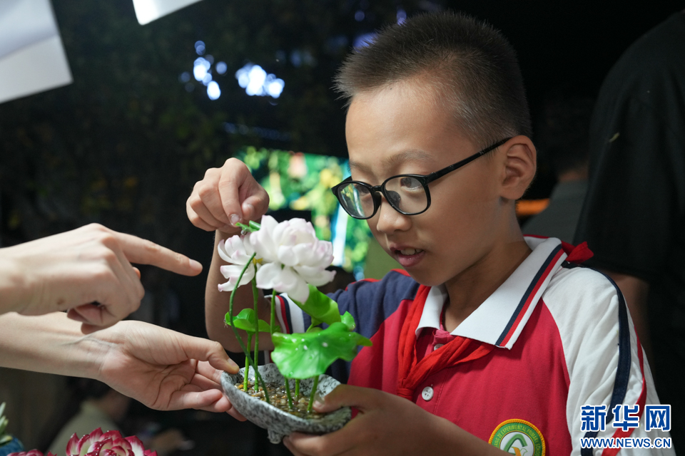 9月25日晚,“好物市集”上,一名小朋友在观赏非遗文创产品,了解延平面塑制作技艺。新华网 肖和勇 摄
