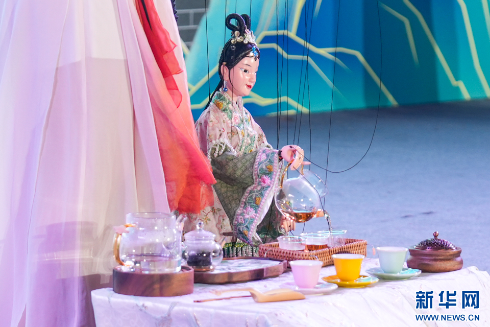 9月25日晚,演员在表演非遗节目提线木偶《茶韵飘香》。新华网 肖和勇 摄