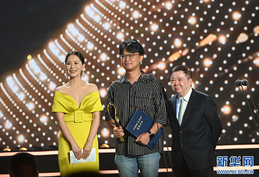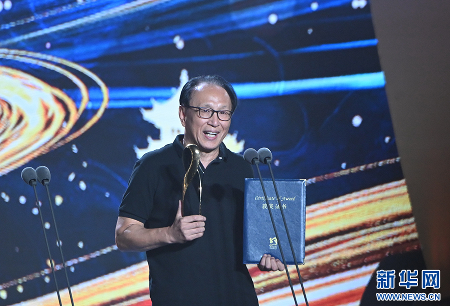 9月26日,获得金丝路奖·最佳编剧的张吉安(马来西亚电影《摇篮凡世》)在现场发言。新华社记者 林善传 摄
