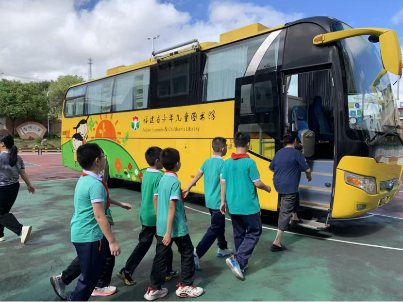 9月26日,以“闽韵福游 墨润山海”为主题的福建省第三届“百年追梦”少儿书法百幅精品展巡展活动在龙岩漳平市举行。活动中,福建省少年儿童图书馆的移动书车开进学校,吸引孩子们上车阅读,让孩子们感受阅读氛围。