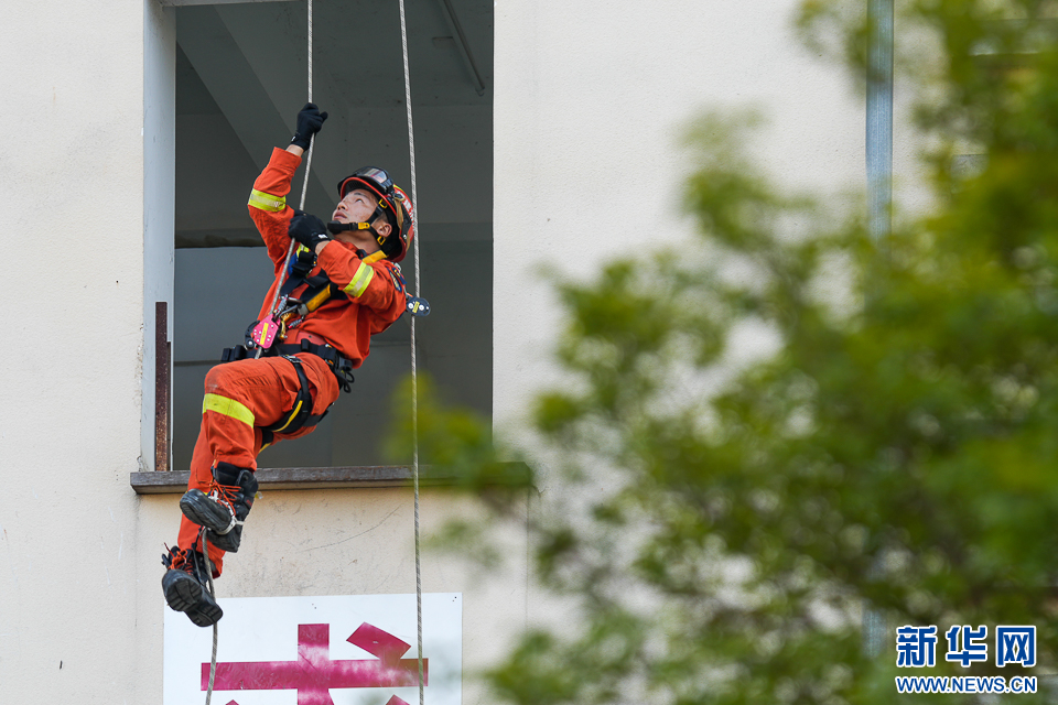 10月3日,消防员在进行爬绳训练。新华网 肖和勇 摄