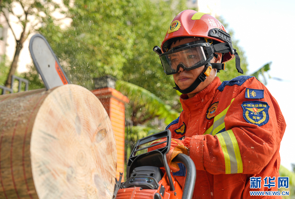 10月3日,消防员操作机动链锯切割原木。新华网 肖和勇 摄