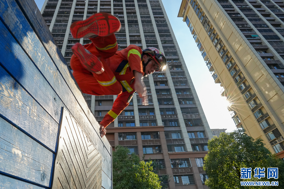 10月3日,消防员在进行翻越障碍板训练。新华网 肖和勇 摄