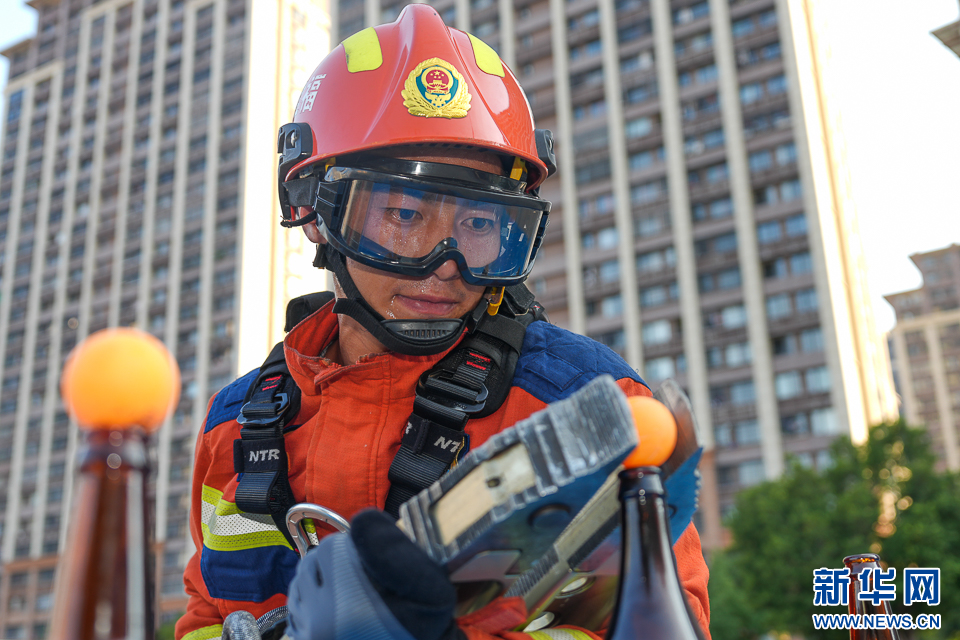 10月3日,消防员用液压扩张器夹起乒乓球,稳稳放在玻璃瓶口处。新华网 肖和勇 摄