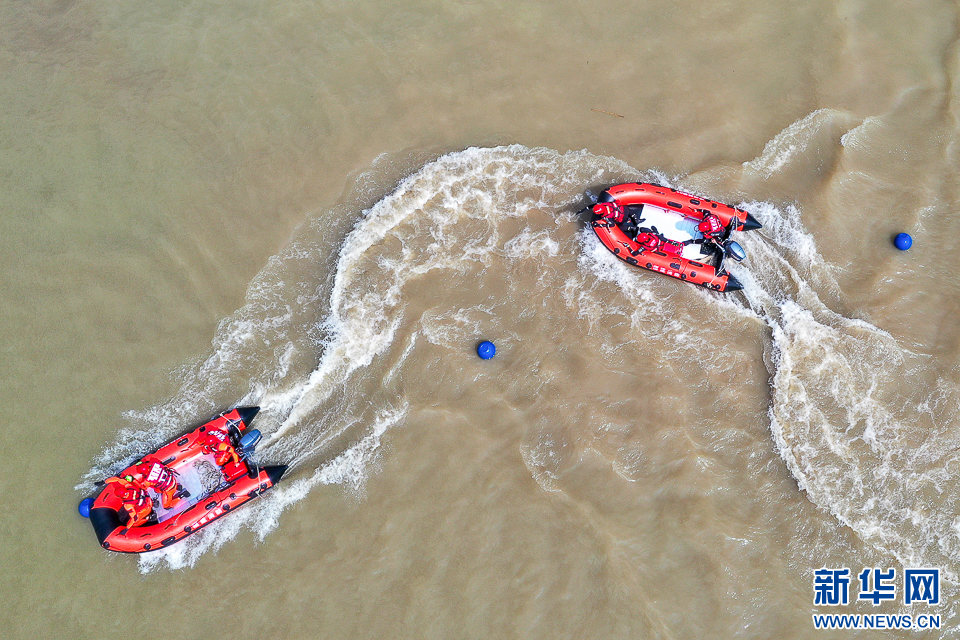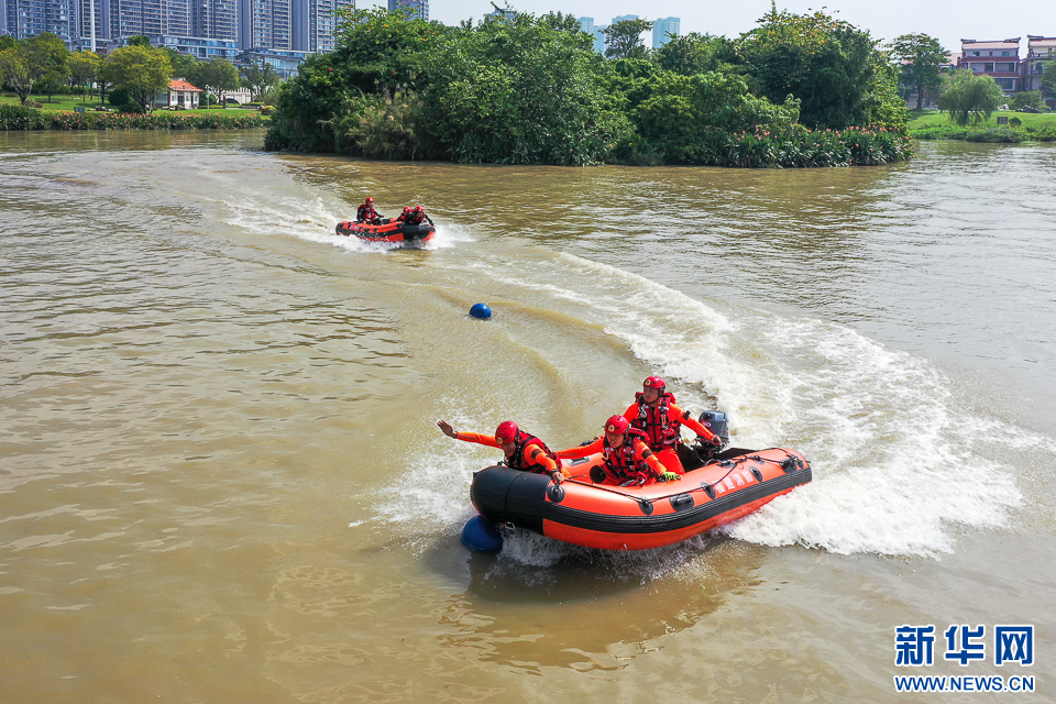 10月3日,漳州市龙文区湘桥湖公园,消防员在进行舟艇编队训练(无人机照片)。新华网 肖和勇 摄