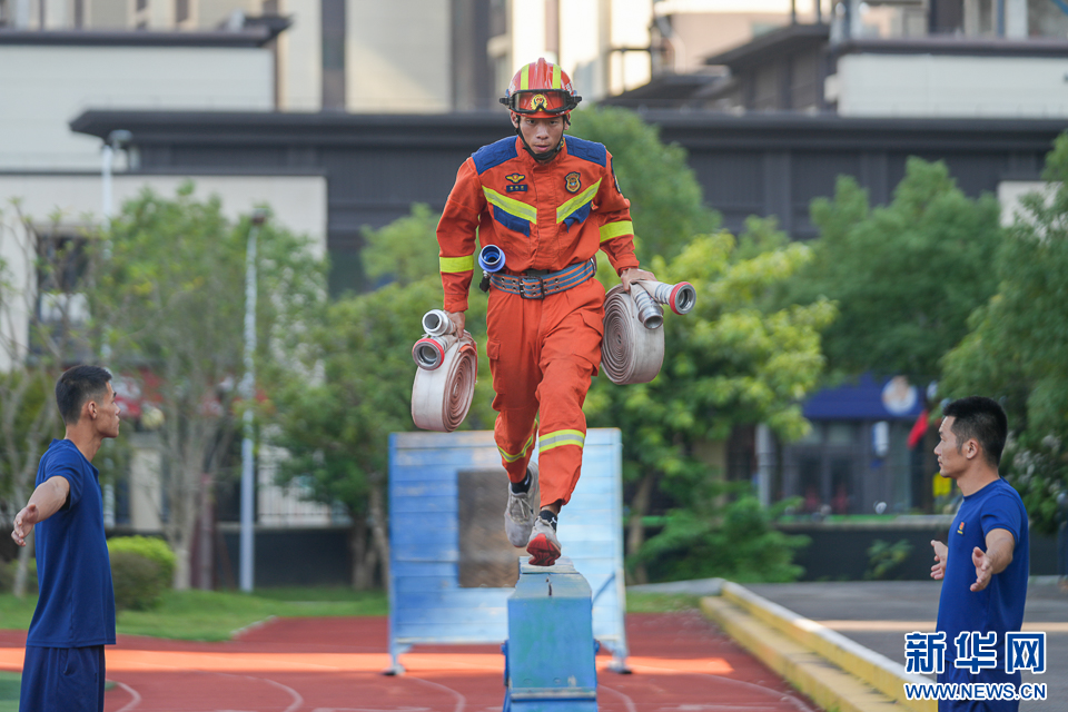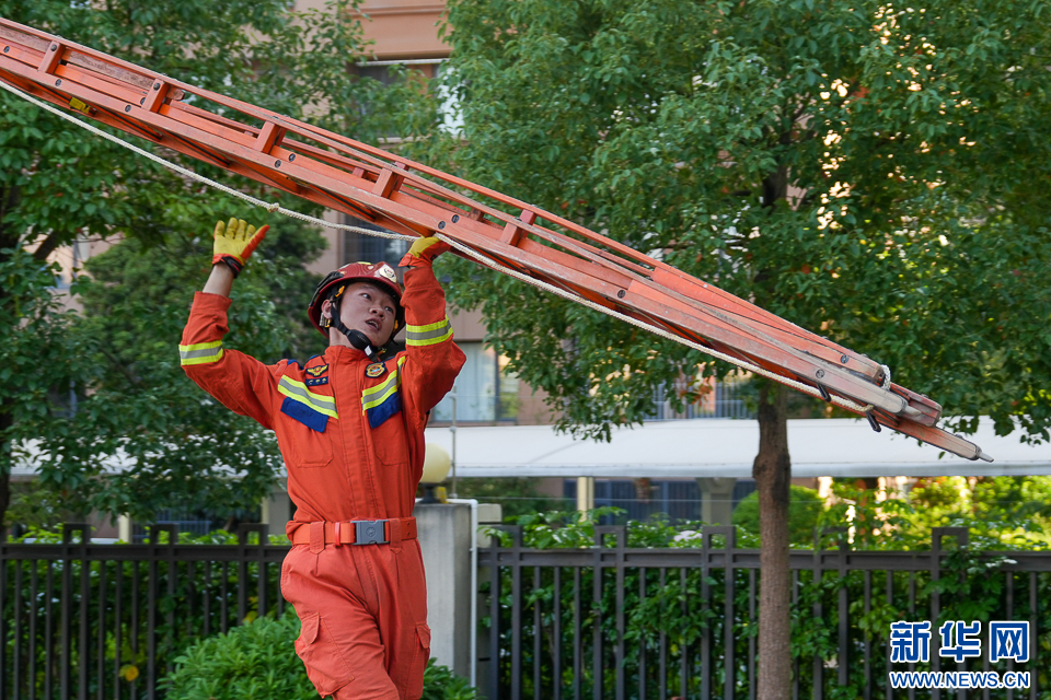 10月3日,消防员在进行肩梯登楼训练。新华网 肖和勇 摄