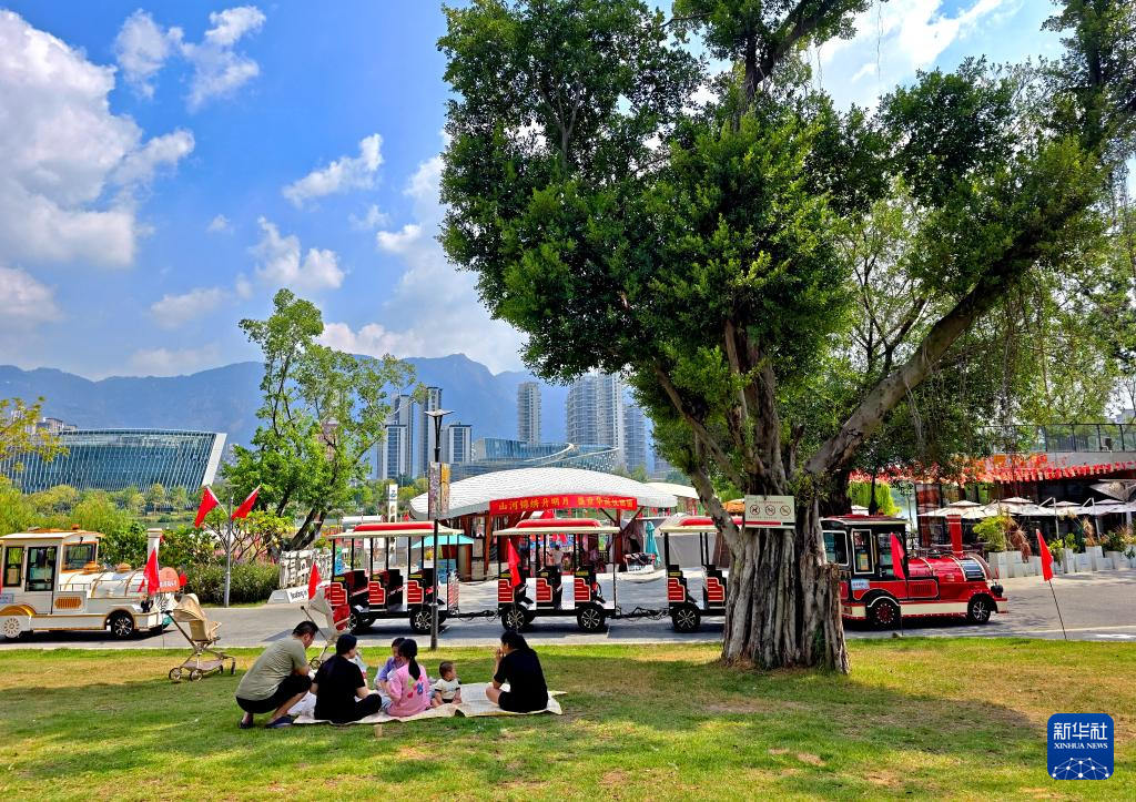 10月6日,人们在福建省福州市晋安湖公园草坪上休闲。