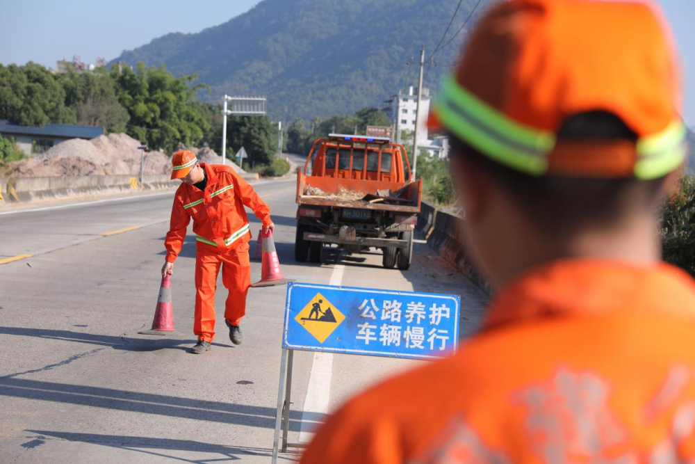 国庆中秋“双节”期间,在南平市建瓯市建瓯公路分中心瑶坪公路站,32岁的公路养护人员谢启晖坚守在国道205线瑶坪路段开展作业。