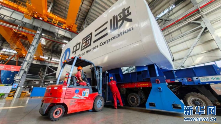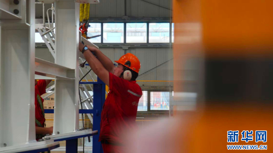 金风科技福清总装厂生产车间里,工作人员给装配完的机舱安装钢支墩。新华网 刘默涵 摄