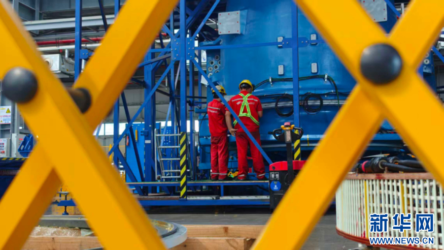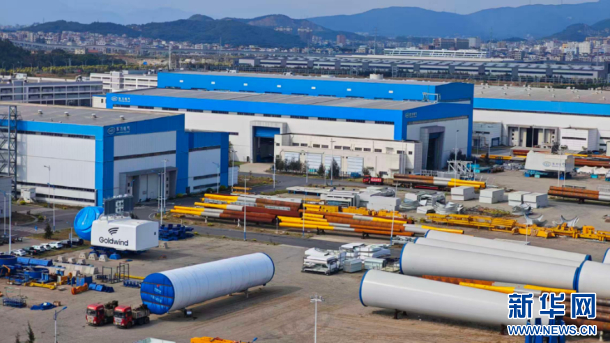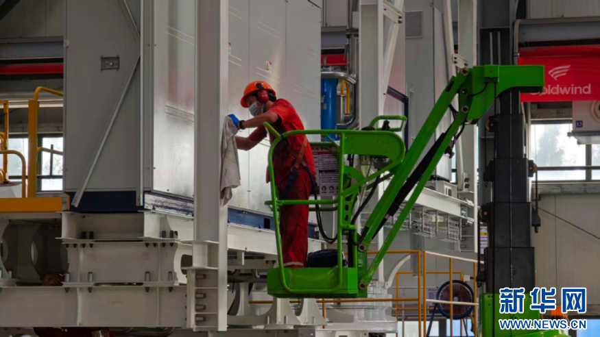 金风科技福清总装厂生产车间里,一名工作人员正在忙碌。新华网 刘默涵 摄