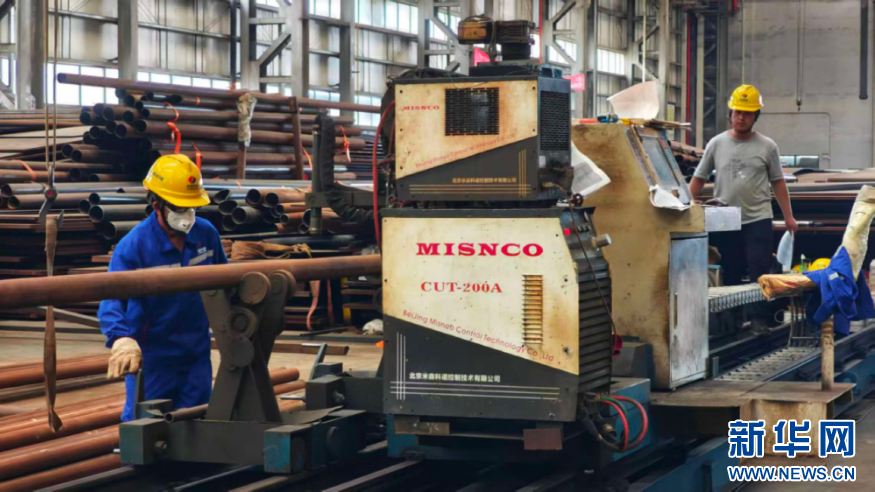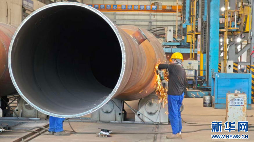 水电四局福清公司生产车间里,一名工作人员正对光伏管桩焊缝进行打磨。新华网 刘默涵
