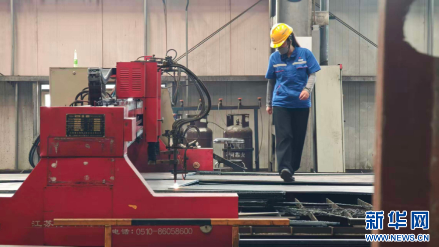 金风科技福清总装厂生产车间里,一名工作人员对结构件进行防腐处理。新华网 刘默涵 摄