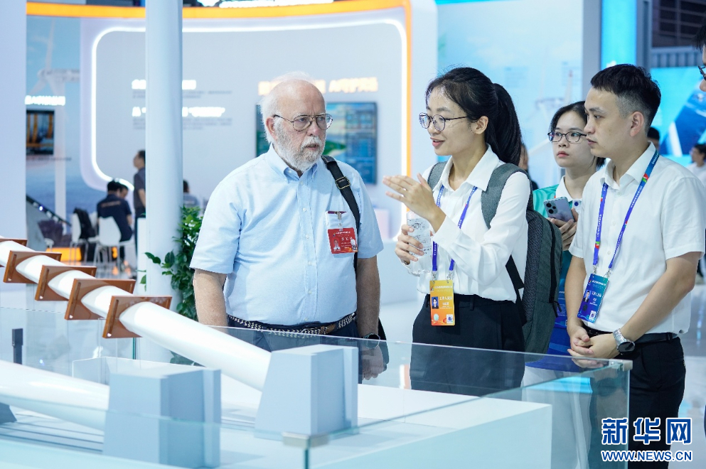 客商参观了解国网福建省电力有限公司展示的海上风电产业相关模型。新华网 蒋巧玲 摄
