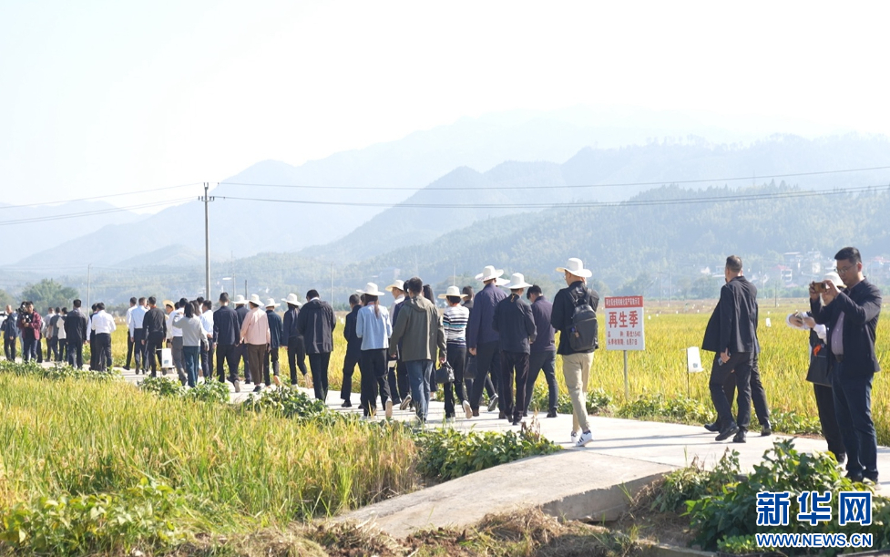 与会人员在浦城县石陂镇案山下村再生稻全程机械化高产示范片观摩。新华网 林晨 摄