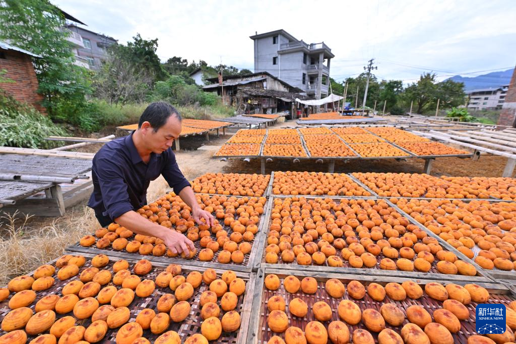 金秋送爽,福建福州市永泰县梧桐镇迎来了繁忙的柿饼加工时节,人们趁晴好天气,将削皮后的柿子摆在房前屋后晾晒,金灿灿的柿子与村落、青山相映,勾勒出秋日好“丰”景。晾晒好的柿饼圆润饱满,入口软糯,是当地传统特色美食。