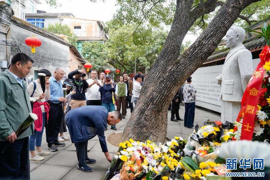 市民群众在福州市仓山区螺洲镇的吴石雕像前敬献菊花,寄托哀思。新华网 蒋巧玲 摄