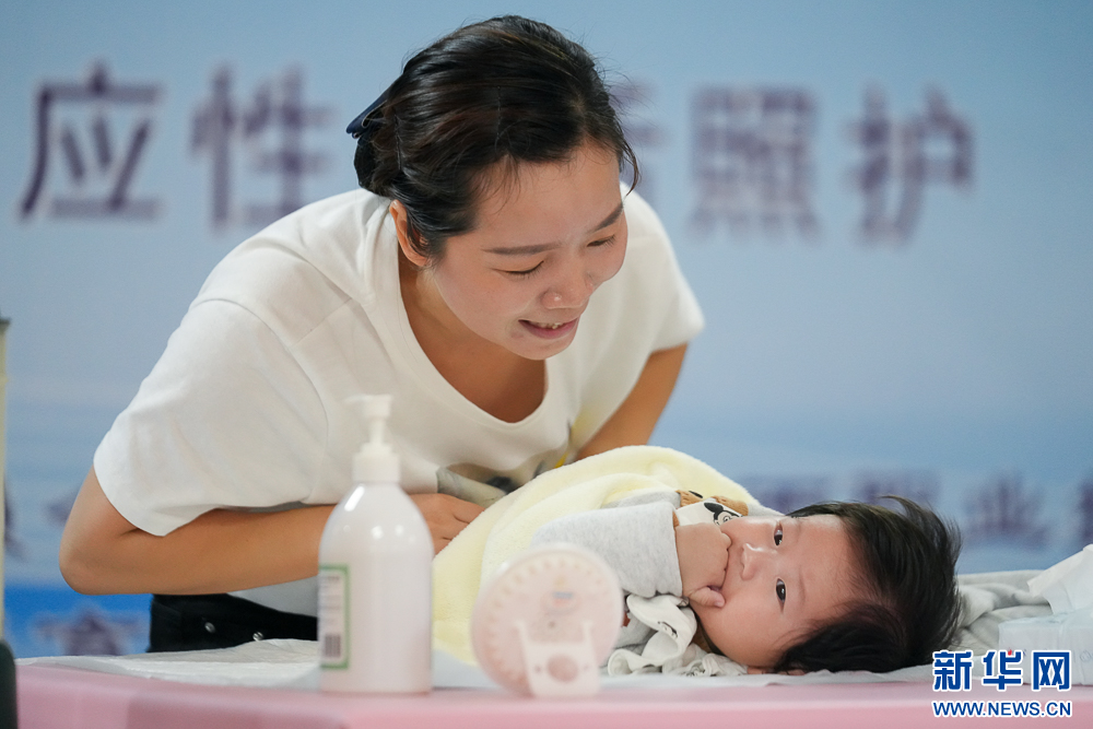在“回应性生活照护”项目比赛中,选手在为宝宝更换纸尿裤。