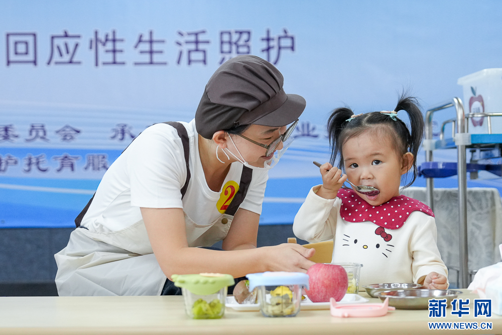 11月8日,在“回应性生活照护”项目比赛中,选手在引导宝宝吃点心。新华网 肖和勇 摄