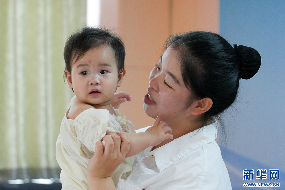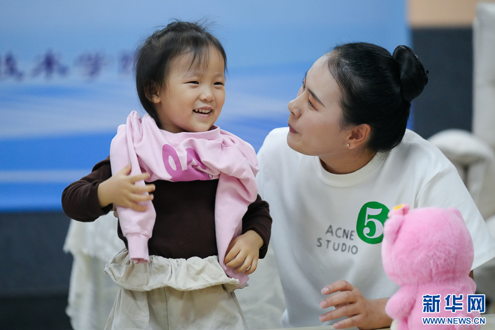 11月8日,在“回应性生活照护”项目比赛中,选手与宝宝互动,鼓励宝宝穿好衣服。新华网 肖和勇 摄