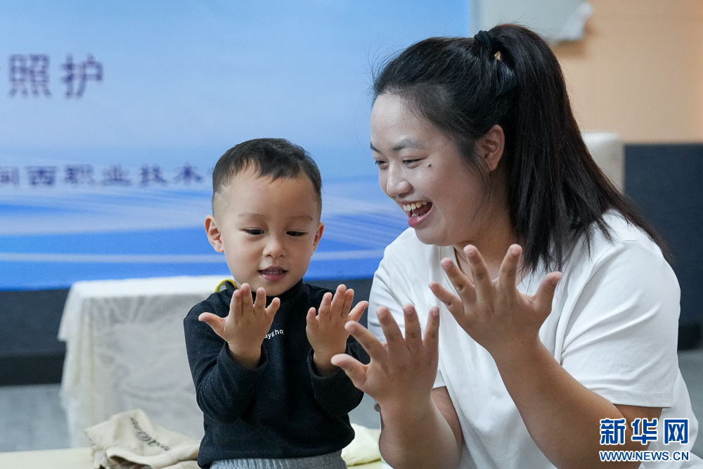 11月8日,在“回应性生活照护”项目比赛中,选手与宝宝互动,完成洗手任务。新华网 肖和勇 摄