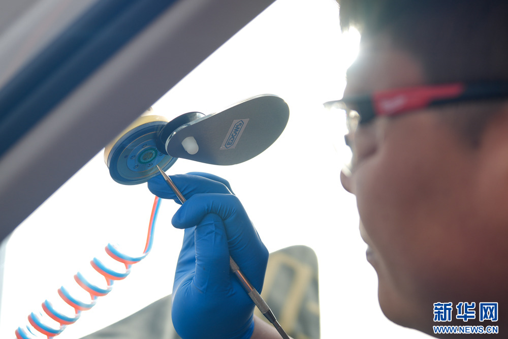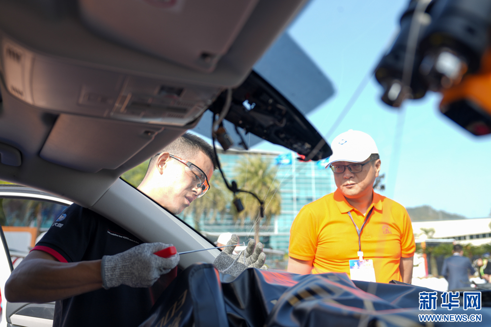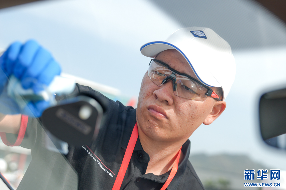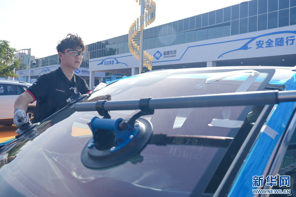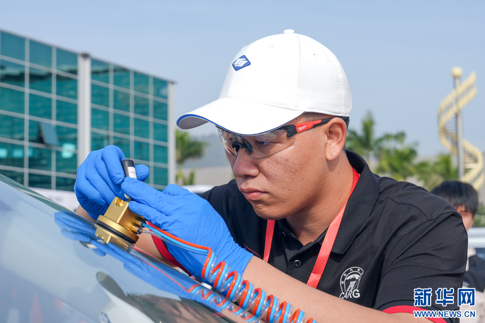 11月28日,汽车玻璃修复技能项目决赛现场,选手在进行修复作业。新华网 肖和勇 摄