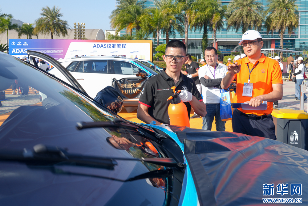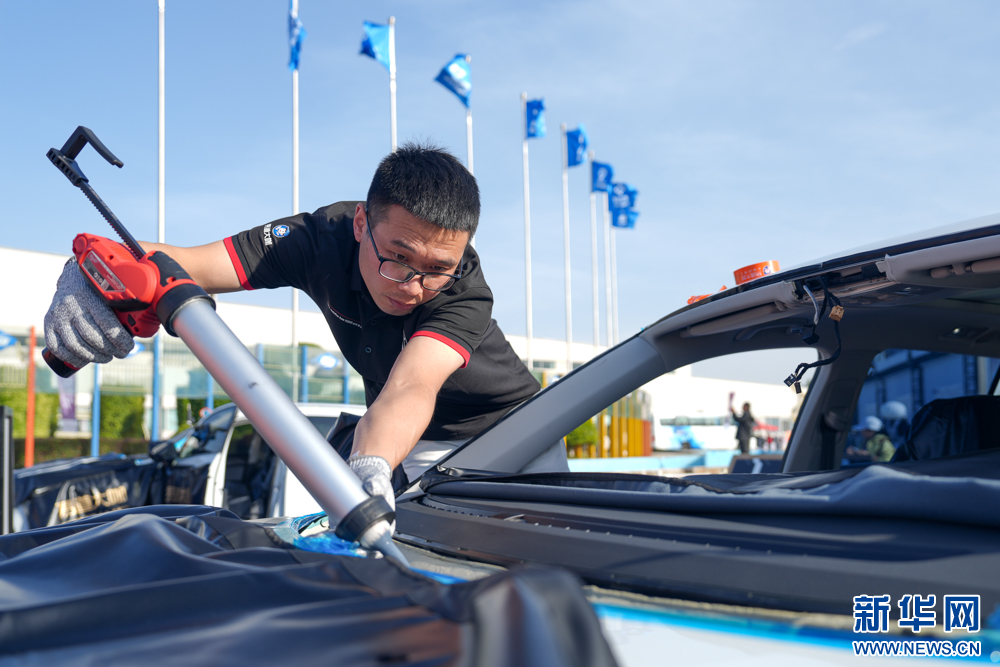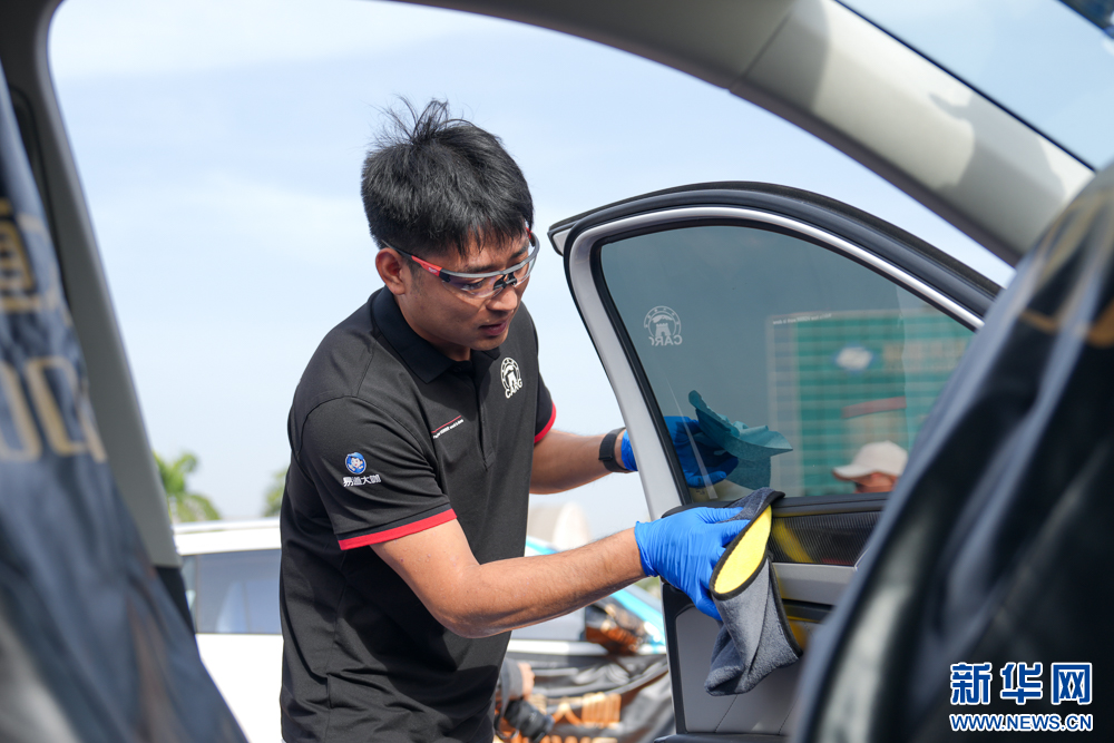 11月28日,汽车玻璃修复技能项目决赛现场,选手完成修复后,对整车进行清洁处理。新华网 肖和勇 摄