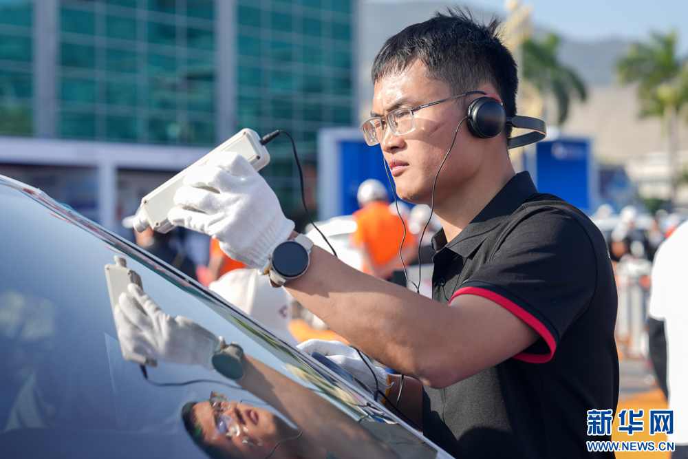 11月28日,汽车玻璃安装技能项目决赛现场,选手对安装好的玻璃进行检查。新华网 肖和勇 摄